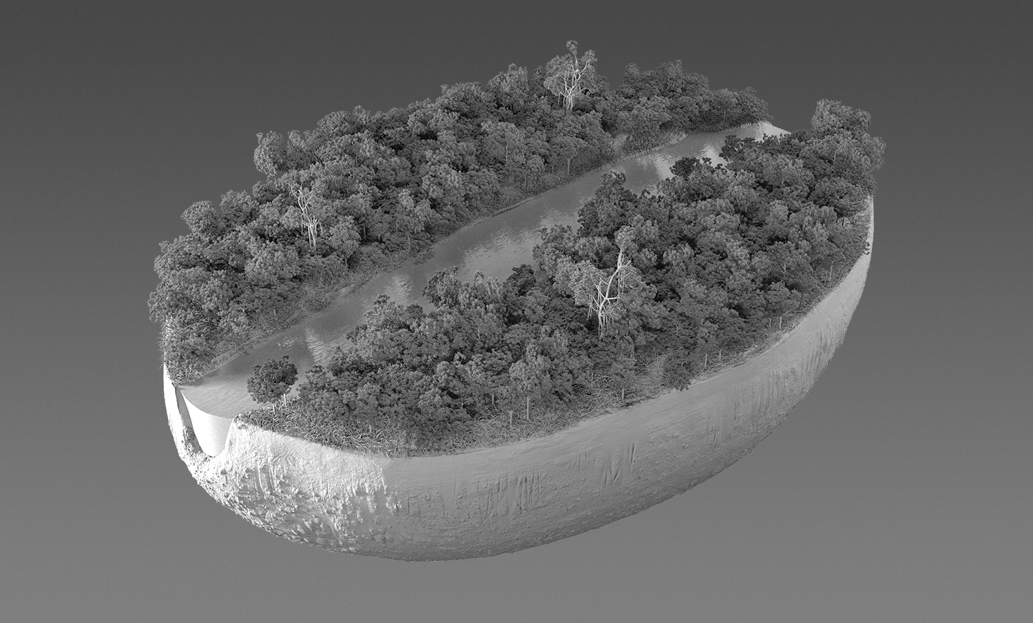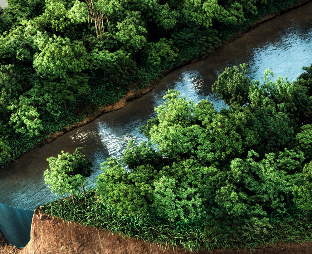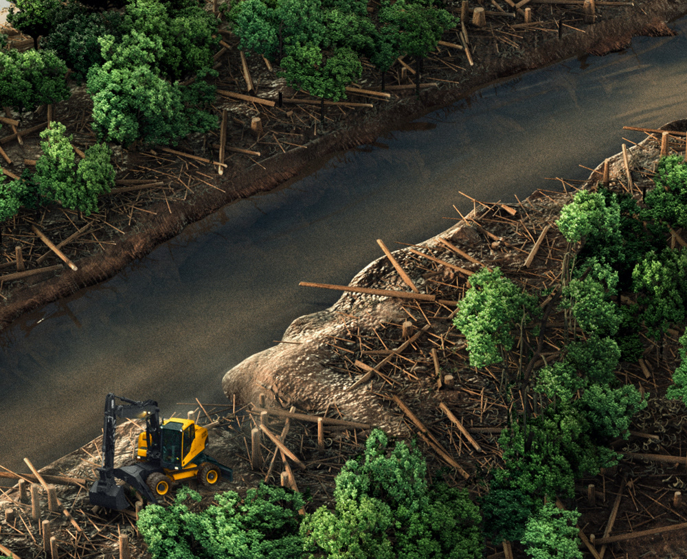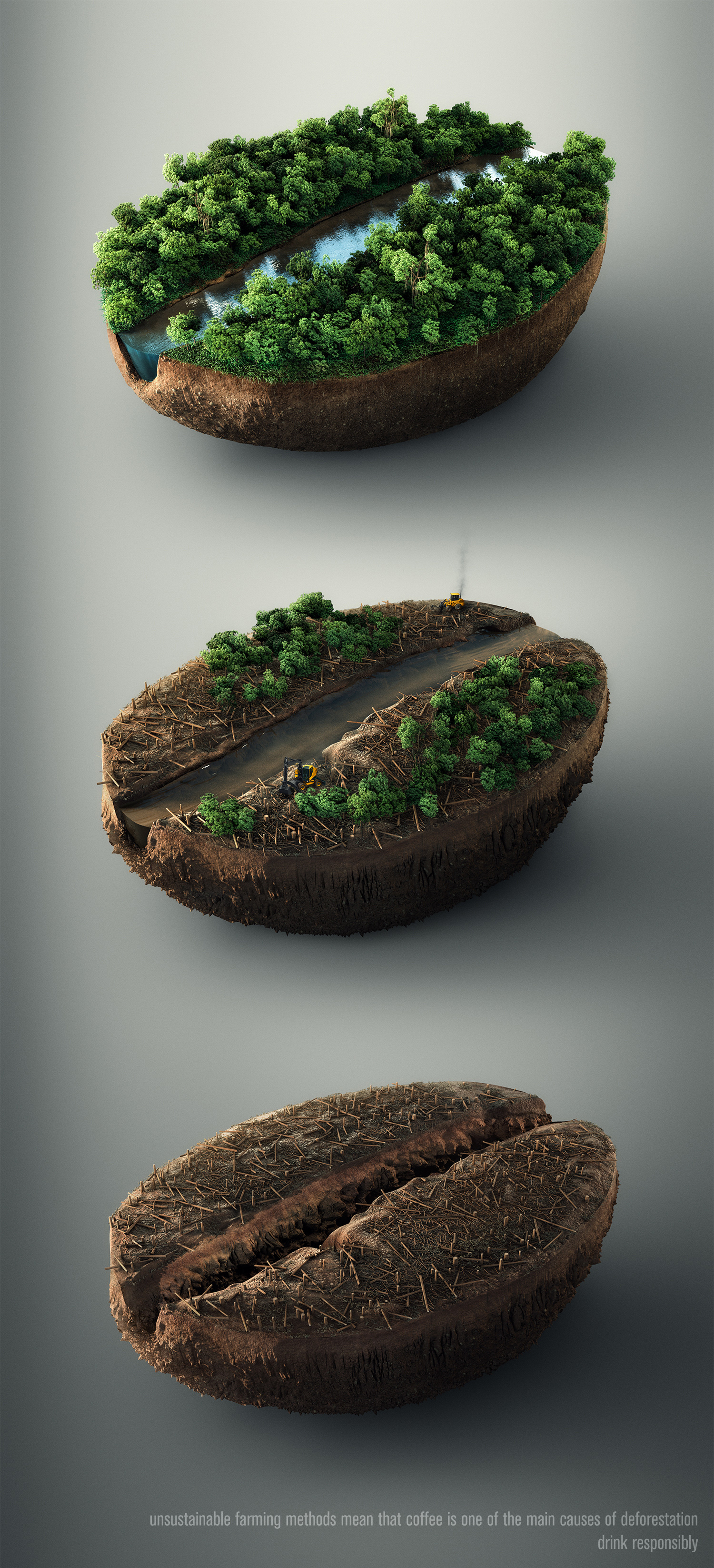 A set of three CGI images showing the effects of deforestation, revealing a coffee bean below. Everything except from the machinery was rendered in 3D.