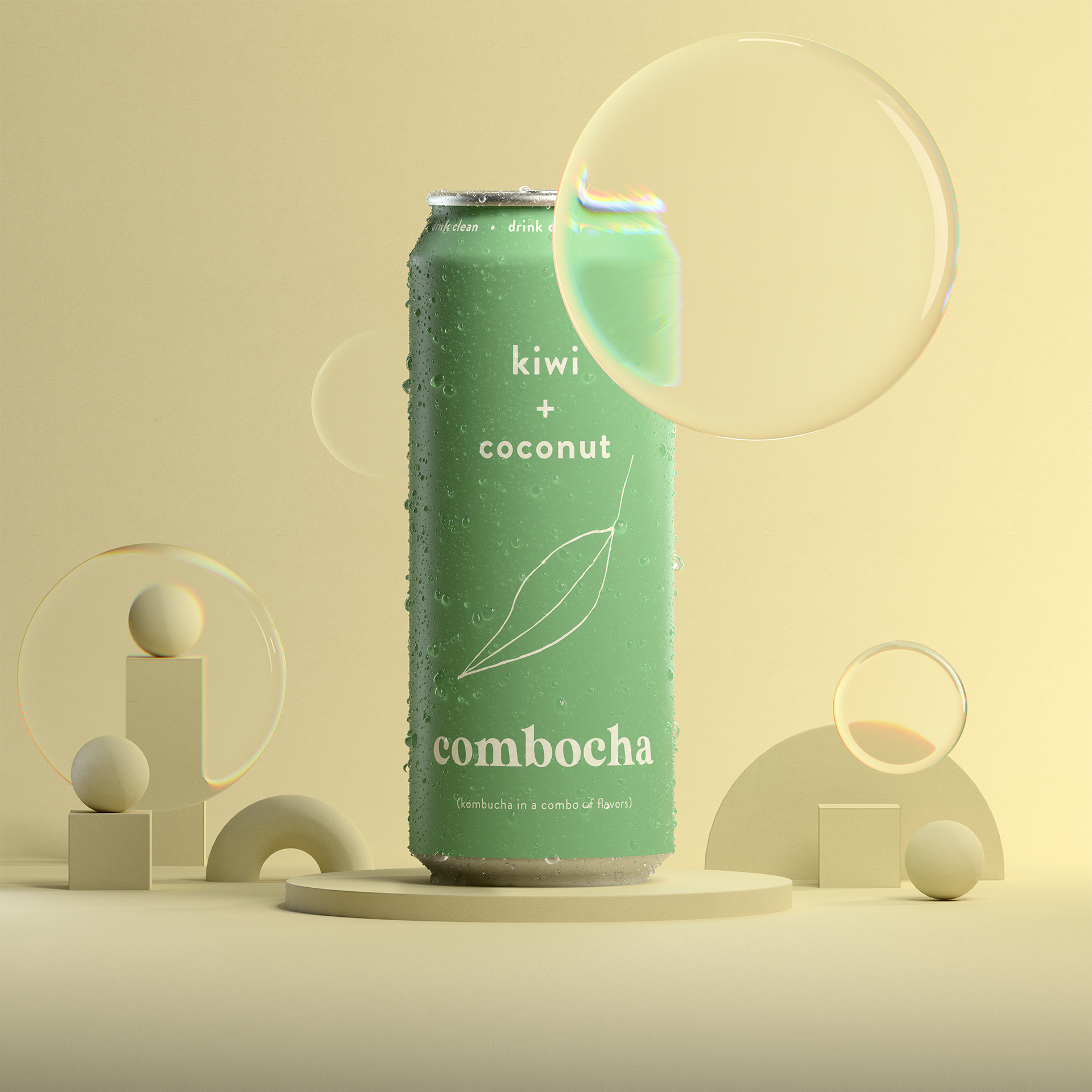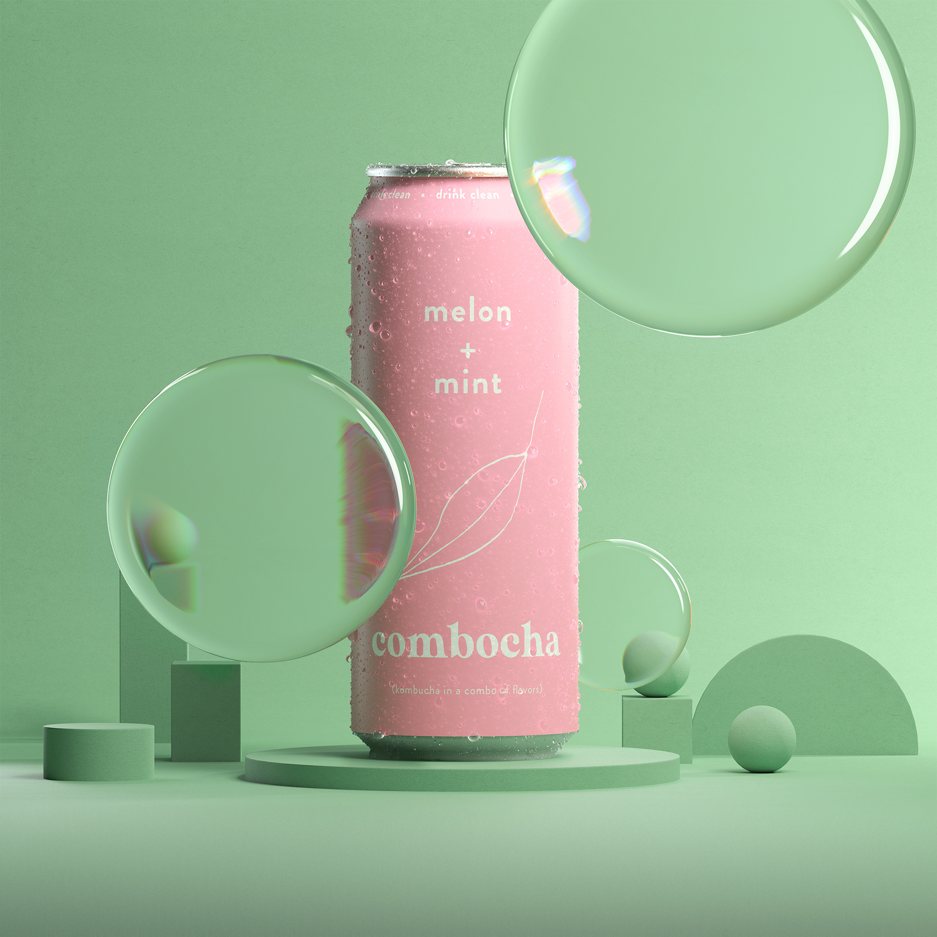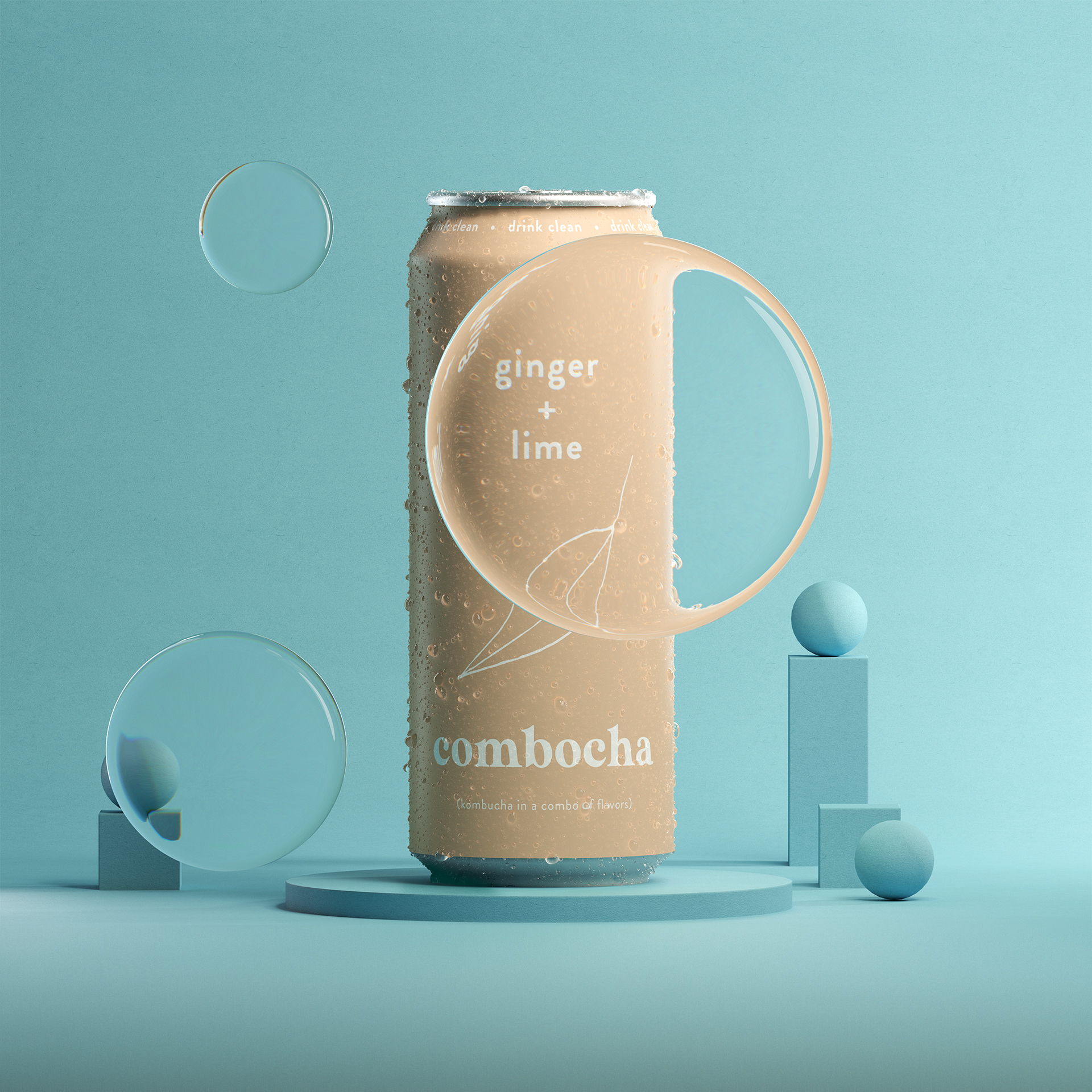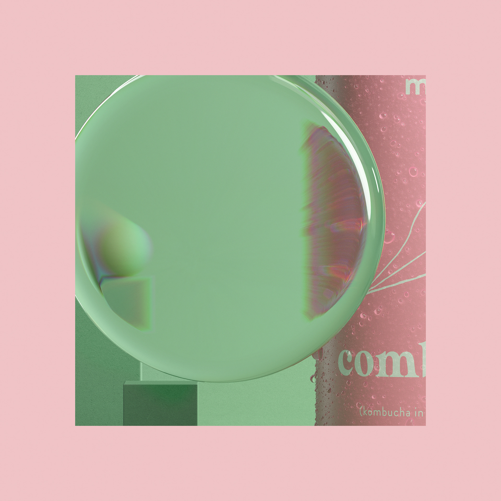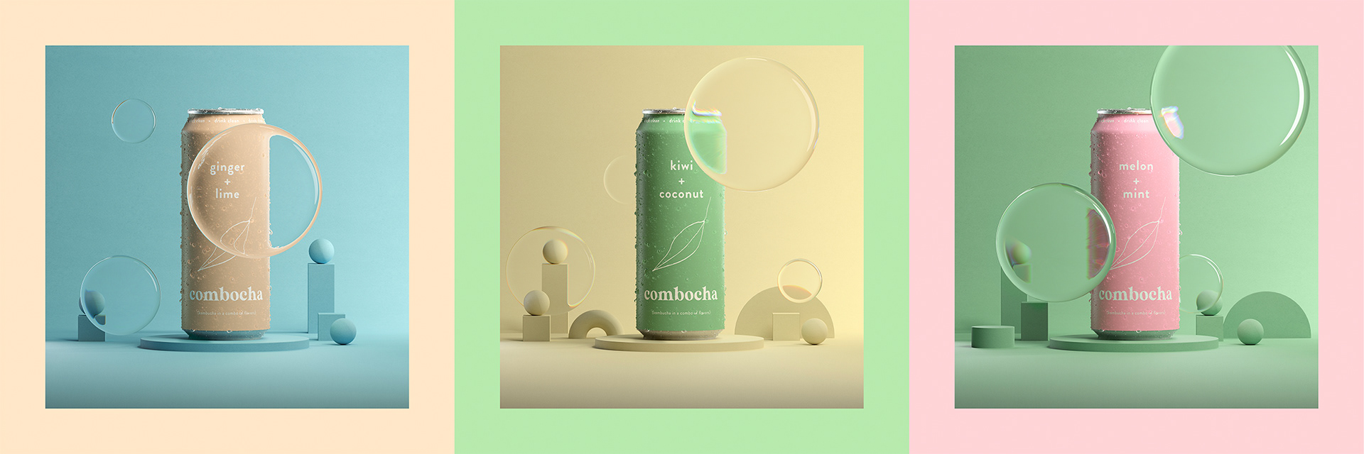 A series of CGI images for Combocha. It was a fun process creating all the spritz and droplets in 3D and working out the realistic light caustics / refraction.