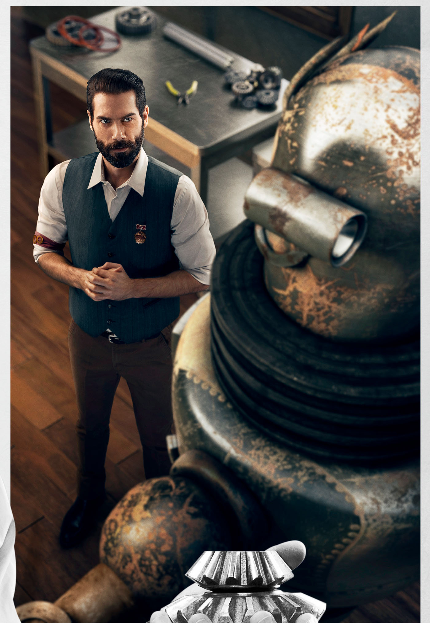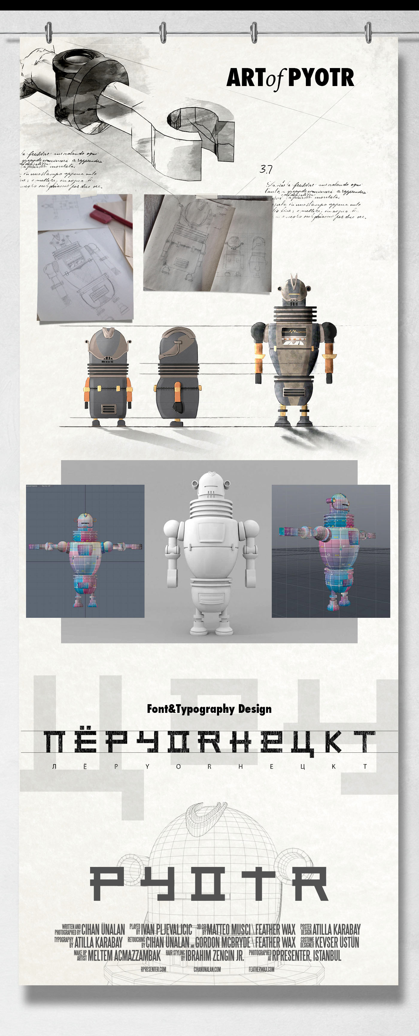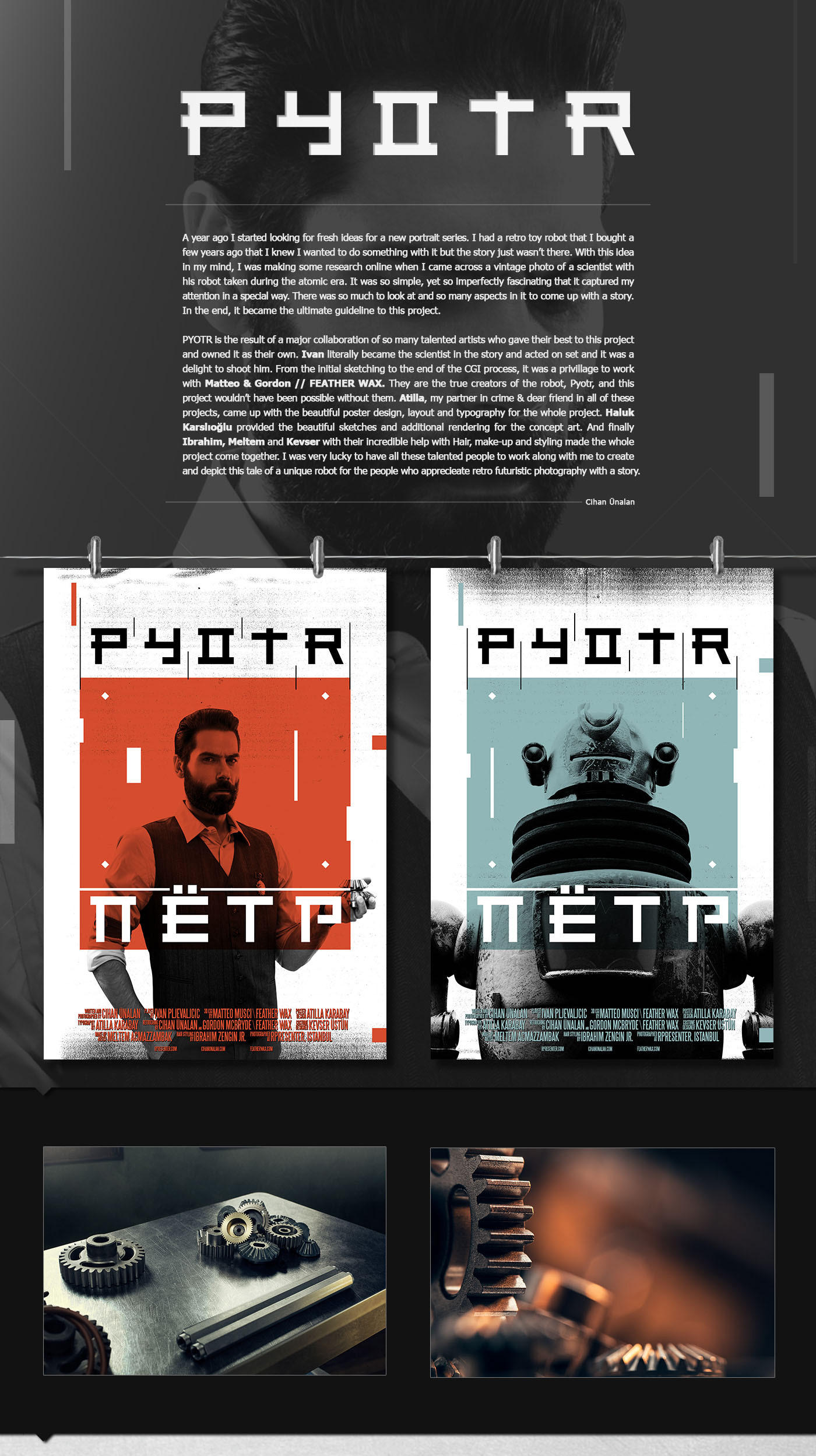 "A year ago I started looking for fresh ideas for a new portrait series. I had a retro toy robot that I bought a few years ago that I knew I wanted to do something with it but the story just wasn’t there. With this idea in my mind, I was making some research online when I came across a vintage photo of a scientist with his robot taken during the atomic era. It was so simple, yet so imperfectly fascinating that it captured my attention in a special way. There was so much to look at and so many aspects in it to come up with a story. In the end, it became the ultimate guideline to this project. PYOTR is the result of a major collaboration of so many talented artists who gave their best to this project and owned it as their own. Ivan literally became the scientist in the story and acted on set and it was a delight to shoot him. From the initial sketching to the end of the CGI process, it was a privilege to work with Featherwax. They are the true creators of the robot, Pyotr, and this project wouldn’t have been possible without them. Atilla, my partner in crime & dear friend in all of these projects, came up with the beautiful poster design, layout and typography for the whole project. Haluk Karslıoğlu provided the beautiful sketches and additional rendering for the concept art. And finally Ibrahim, Meltem and Kevser with their incredible help with Hair, make-up and styling made the whole project come together. I was very lucky to have all these talented people to work along with me to create and depict this tale of a unique robot for the people who appreciate retro futuristic photography with a story." Cihan Ünalan